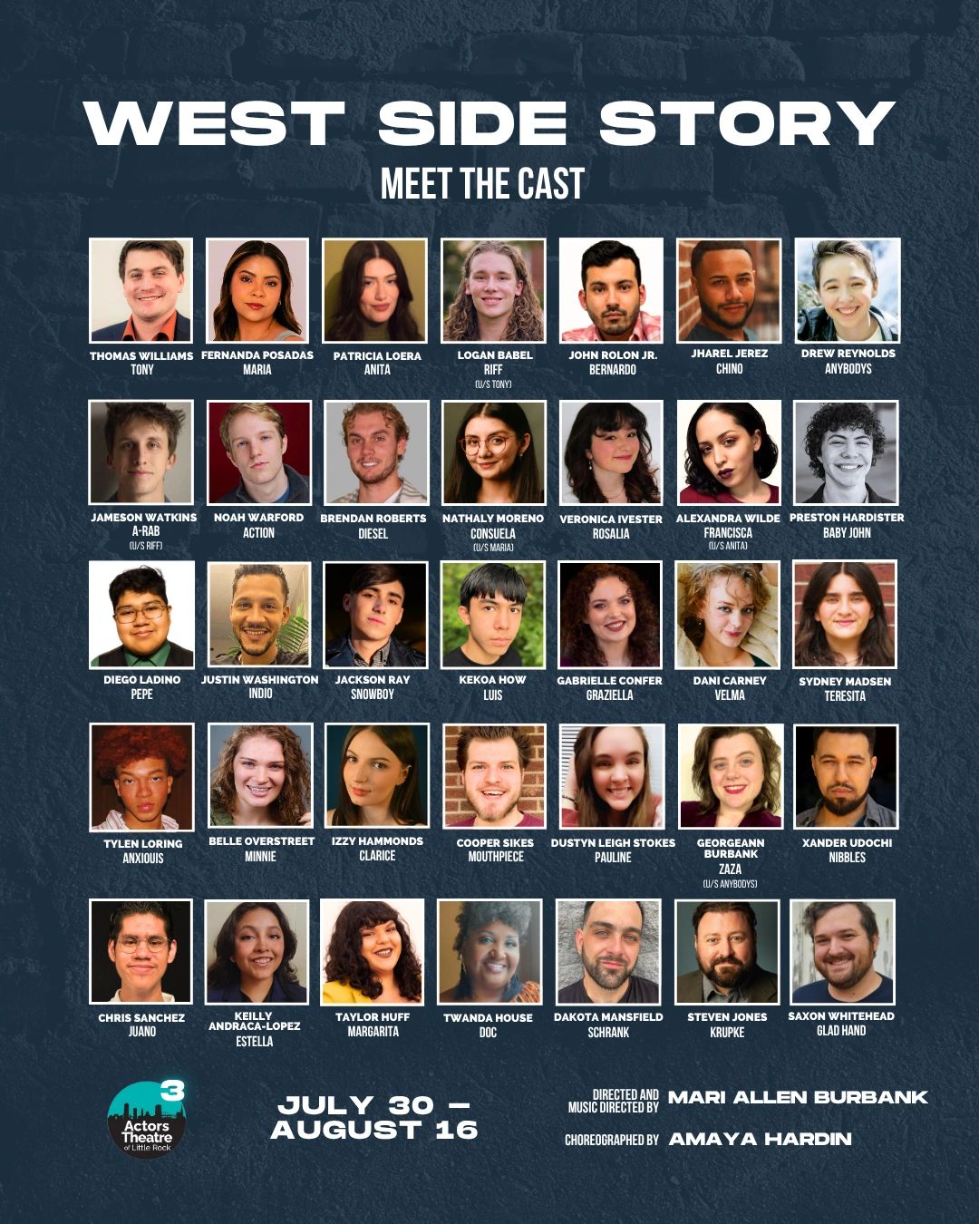 West Side Story opens July 30 and runs through August 16 at Actors Theatre @ Quapaw Quarter United Methodist Church! See below for information about the show, seating & tickets, the cast, and more!